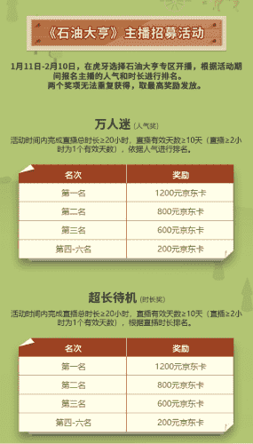 除了“油王”争霸赛,,,,精英主播招募活动亦同步开启!!!!赛事分时长奖和人气奖,,,奖励同样丰厚!!