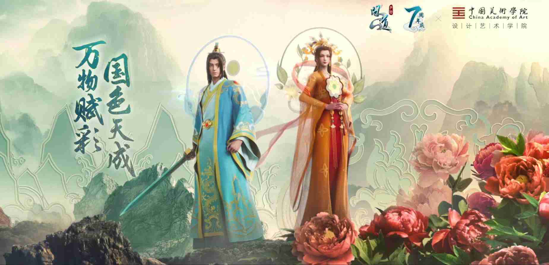 2023年4月,,,,《问道手游》联动中国美术学院,,在游戏中融合了中国历史上不同时期的文化元素,,打造了“山河万象”与“凤鸣九霄”的国风时装。。。在色彩配置方面,,,创作团队基于对游戏角色特性的分析提取相应的文化内涵,,,,从每一种色彩的色相、、、指代事物和情感出发对应角色属性,,,选定服装的色彩搭配。。。在纹样设计方面,,,,创作团队结合游戏角色自身特殊的造型比例和形态,,在实际的纹样设计中进行了游戏语境下的活化演绎。。。。男性角色集中使用了如蟒纹、、、、海水江崖纹、、、如意纹和云气纹等传统纹样元素,,,女性角色则吸纳了凤凰纹、、牡丹纹、、、卷草缠枝纹等元素,,,组成以“双凤牡丹纹样”“缠枝牡丹纹”“金玉凤冠头饰”为主要纹样的游戏角色装饰图案系统。。